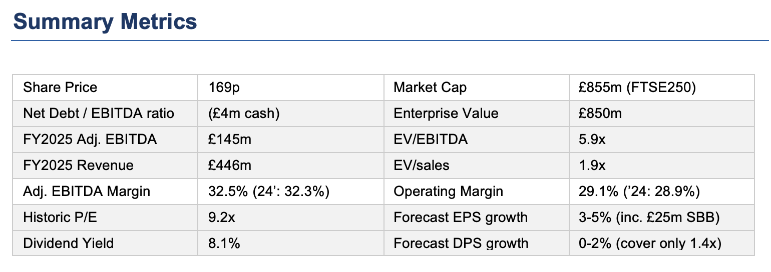 • 2026 Adj. EBITDA consensus: £146m (range £142m-£153m), implying circa +1% growth from FY2025.