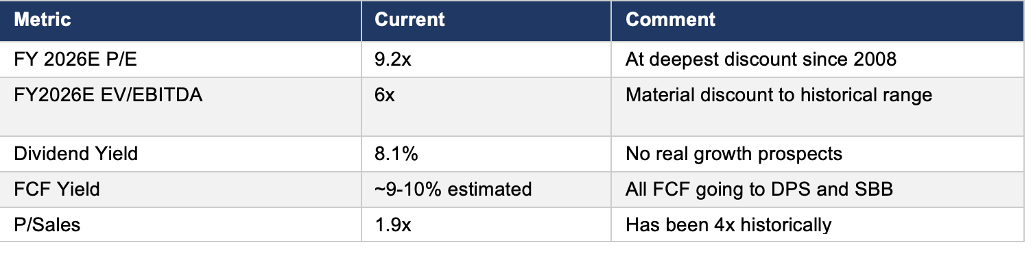 The 9x trailing P/E is the lowest since the 2008 financial crisis, in the context of a business that just reported its highest-ever revenue and EBITDA.