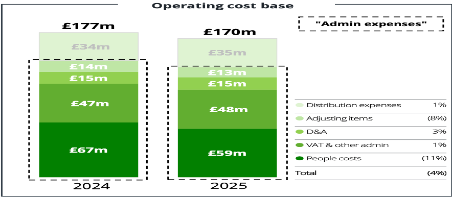 Capex has peaked and fell last year to only £9m (2% of sales, mainly tech) v £14m in ’24, reflecting the capital light nature of the model. They spent £42m on tech/product in ‘25 with the other £33m taken to the P&L – looks pretty clean. The total reinvestment rate which includes brand marketing, capex, new product development etc. was 9% of sales in ’25 v 11% in ’24 so overall investment has been falling from a previously high level. Management are not flagging any AI-related expenses from here and claim to have a fully invested and integrated platform.