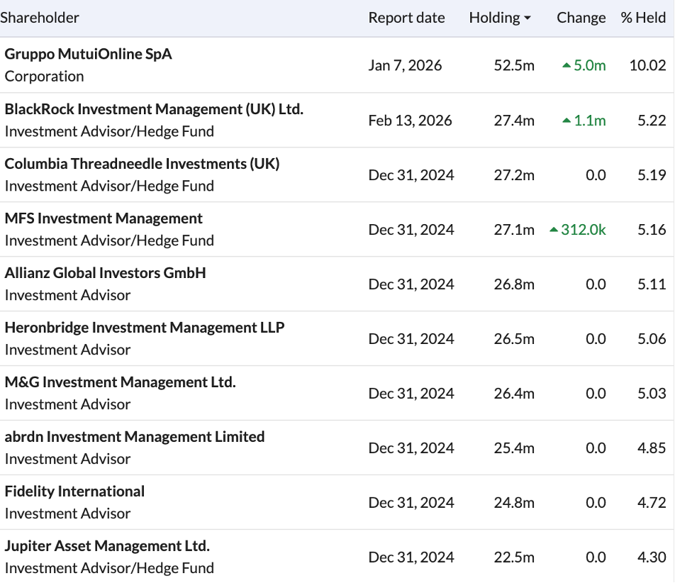 Other shareholders - interesting stake of 10.0% held by an Italian PCW player, Gruppo MutuiOnline, which they have built up since 2022. Other than that it’s a fairly mainstream institutional list.