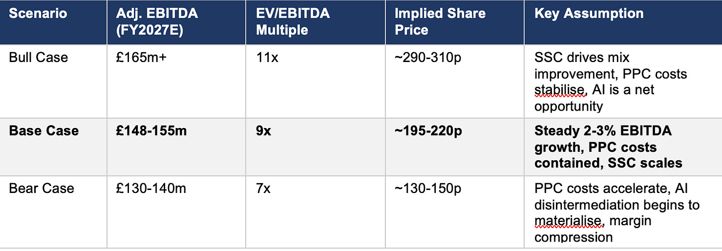 At 169p today’s share price is just above the bear case shown above after a post-results bounce this week. The base case implies 15-30% upside from current levels. The key variables IMO are not near-term earnings — these appear stable — but the trajectory of PPC costs, the credibility of the SuperSaveClub as a margin offset to this and the unknown medium term impact of rival AI solutions.