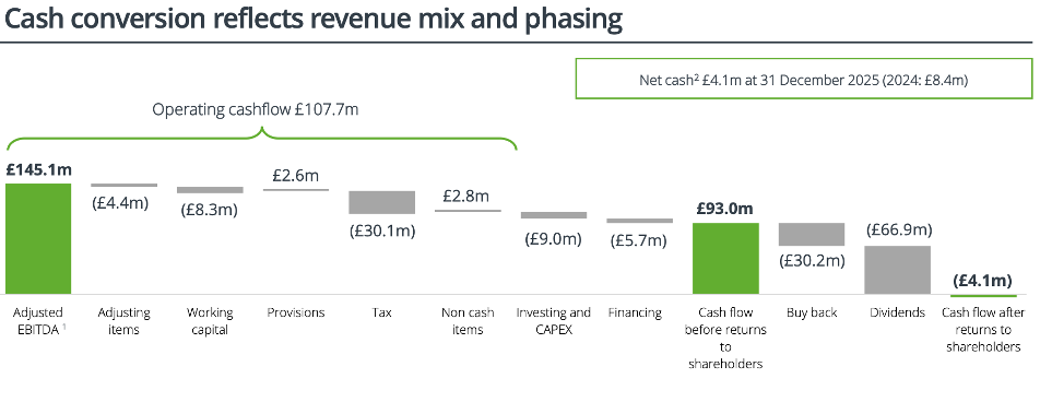 Operating cash flow of £108m in FY2025 was down 7% mainly due to working capital swings. These are usually not material but increased activity in energy and life assurance did have an impact in 2025 with cash conversion lower at 74% compared to >90% historically. A metric worth keeping an eye on given the slippage in 2025 and the the improved activity in these areas.